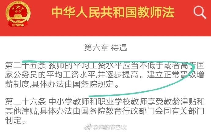 《教师法》规定,“教师的平均工资水平应当不低于或者高于国家公务员的平均工资水平,并逐步提高”。2018年发布的《全面深化新时代教师队伍建设改革的意见》将“平均工资水平”的说法改为了"平均工资收入”,后者比前者更为精准。但在很多地方,教师工资水平与当地公务员工资水平都存在不小的差距。
