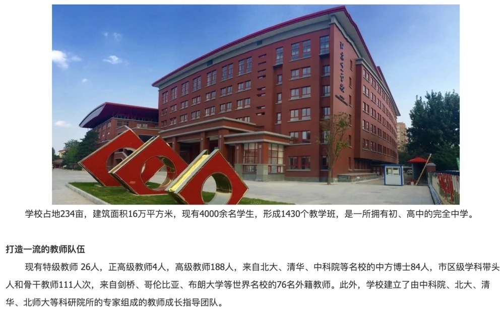 据北京十一学校官网的资料显示,该校现有特级教师26人,正高级教师4人,高级教师188人,其中来自北大、清华、中科院等名校的中方博士84人,来自剑桥、哥伦比亚、布朗大学等世界名校的76名外籍教师。此外,学校建立了由中科院、北大、清华、北师大等科研院所的专家组成的教师成长指导团队。相比而言,深圳中学逊色不少,2017年,深圳中学博士学历教师还只有4人。