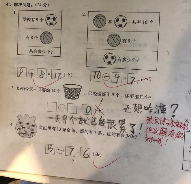 老师看后觉得这位小朋友很有爱心,但是由于没做对,也不能给分,于是扣了这一题的分,然后评语写道:很会体谅奶奶,但是这题确实没做对哦!