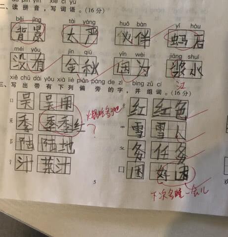 写出带有偏旁的字,然后再组词,看到困组词这里,我忍不住笑了。困:好困。