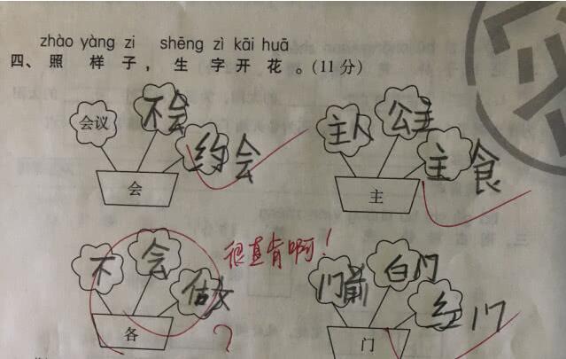 用“各”组三个词,学生表示不会写,然后写上不会做3个字,老师生气了,打了一个问号,评语写道:很中肯啊!