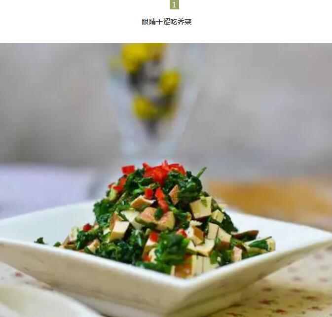 办公室白领易发生干眼症,荠菜中含有丰富的胡萝卜素,多吃荠菜能预防干眼病,也可以减轻眼睛干涩不适的症状。