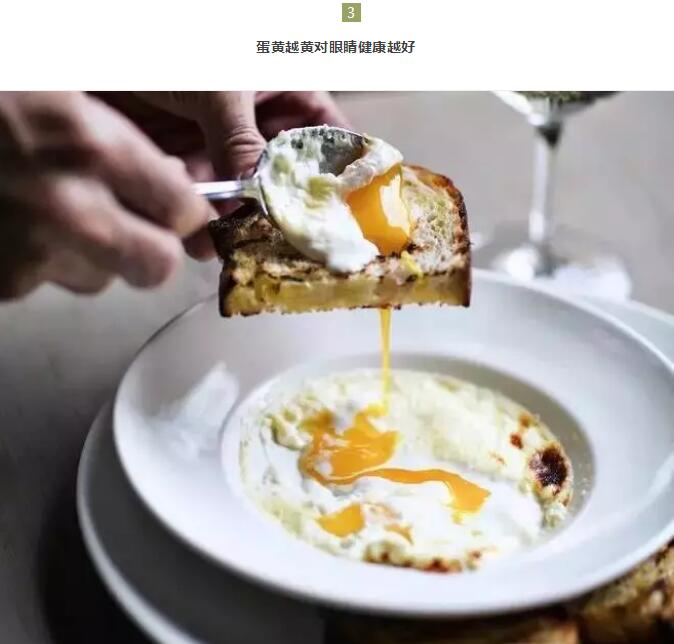 蛋黄中颜色为深黄色的,正是叶黄素和玉米黄素的来源。蛋黄中的脂溶性黄色物质当中,有1/3以上来自于这两种成分,而且非常容易被人体吸收。因此对于正常的蛋,蛋黄的颜色越黄,对眼睛健康越有好处。
